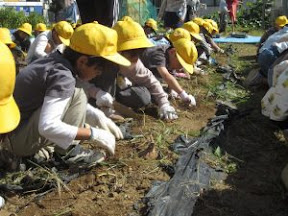 「かぼちゃみたい」「細いぞ!」「2個つながっている!」「あ~ちがった!」など楽しく掘ることができました。さつまいもを掘ったあとも,根の先をたどり一生懸命掘る姿がかわいかったです。
